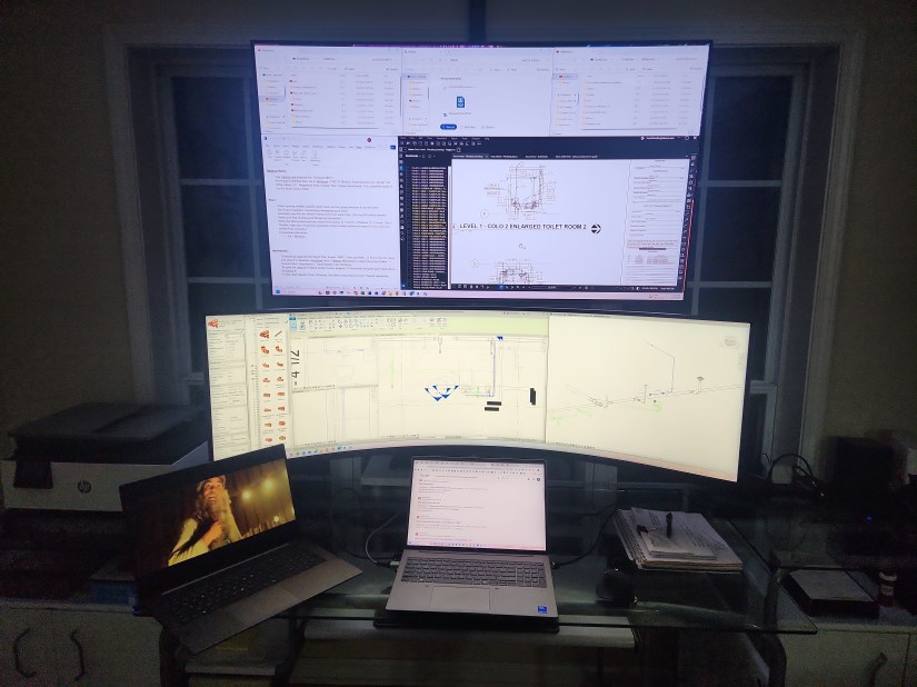 I’ve recently set up an awesome work/entertainment station at home. I didn’t realize how an increase in computer screen real estate could be so helpful until I actually began working as a plumbing designer. I bought a 57″ Samsung Odyssey curved monitor and a 55″ Samsung OLED TV to mount above it. I’ve got plenty of screen real estate now for work and entertainment purposes.